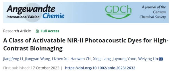 Recently, the Probe and Chemical Biology Team of the School of Chemistry and Chemical Engineering of Guangxi Univeristy has made a breakthrough in NIR-II ( 900-1700 nm) optical imaging. The team constructed a series of activatable NIR-II photoacoustic dyes platform GX, publishing a paper titled “A Class of Activatable NIR-II Photoacoustic Dyes for High-Contrast Bioimaging” (DOI: 10.1002/anie.202312632) in Angewandte Chemie International Edition, which focuses on the challenge that the lack of groups that facilitate the optical tuning in NIR-II photoacoustic dyes hinders the effective application of NIR-II photoacoustic dyes in complex and diverse molecular imaging. The lead author of the paper is Li Jiangfeng, a Ph.D. candidate of the School of Chemistry and Chemical Engineering in Guangxi University, and the corresponding author is Prof. Dr. Lin Weiying, Guangxi University being the first affiliation.