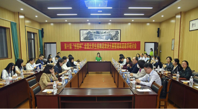 From May 12 to 14, the 10th " Shi Tu Cup " National Student Vietnamese Speech Contest and Vietnamese Language Teaching Seminar was held in our university. The contest was organized by the Organizing Committee of the National Student Vietnamese Speech Contest, hosted by Guangxi University, and co-sponsored by the School of Foreign Languages, Guangxi University and World Book Publishing Guangdong Co.Ltd. 104 players, experts and scholars from 25 universities across China attended the conference.