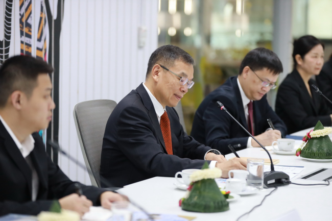 Minister Wu Zhiwu and Counselor Xu Lan of the Chinese Embassy in Thailand received the delegation, and listened to Mr. Han Linhai's report on talent cultivation, academic research, cultural exchanges, and other issues between Guangxi University and Thai universities, government sectors and scientific institutions. They fully affirmed the internationalized development strategy of Guangxi University of "Deeply Cultivating ASEAN and Facing the World" and the outstanding achievements of GXU in serving China-ASEAN development. They expressed that they would strongly support GXU to carry out education and teaching for foreign students in Thailand, the construction of Confucius Institute at Suphanburi and cultural exchanges between China and foreign countries, and also hoped that Guangxi University would continue to serve the construction of the "the Belt and Road" and the overall diplomatic situation of the country. Han Linhai stated that Guangxi University would carry out deeper exchanges and cooperation with Thailand in education, science and technology, culture, talent exchange and other fields based on its own characteristics and advantages, striving to make new breakthroughs in standardization, regional technology and socio-economic development, and contribute wisdom and strength to the construction of a closer China-ASEAN community with a shared future.