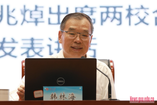 GS. TS. Hàn Lâm Hải đã giới thiệu Trường Đại học Quảng Tây cho các học viên cao học khoá 2024 dựa trên lịch sử, tình hình nhà trường và quan niệm giáo dục và đào tạo của trường, đồng thời đưa ra 5 quá trình phát triển của trường chúng tôi như Thành lập nhà trường tại Ngô Châu, Phát triển nhà trường tại Quế Lâm, Phục hội nhà trường tại Nam Ninh, Cải cách tiến bộ và Kỷ Nguyên Mới. Ông đã thể hiện một cách toàn diện về quy hoạch tổng thể của trường từ 7 khía cạnh, bao gồm tổng quan về trường, định vị xây dựng trường, đặc điểm giáo dục và đào tạo, đội ngũ giáo viên, chương trình đào tạo tiến sĩ, nền tảng nghiên cứu khoa học và thành quả xây dựng mang tính tiêu biểu v.v, đồng thời trình bày quan niệm đào tạo học viên cao học của trường chúng tôi từ 4 mặt về khái niệm và mục tiêu, mô hình và phương pháp, đảm bảo và chất lượng, quy hoạch và tầm nhìn.