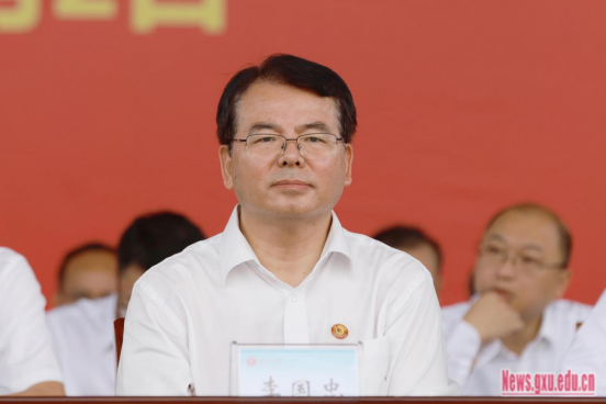 Các vị lãnh đạo và viện sĩ ngồi ở hàng ghế đầu đã trao tặng huy hiệu trường cho các đại diện tân sinh viên khóa 2024. Phó Bí thư Đảng ủy Nhà trường, Trưởng nhóm Kiểm tra Kỷ luật và Giám sát của Uỷ ban Kiểm tra Kỷ luật và Giám sát khu tự trị tại Đại học Quảng Tây, Bí thư Uỷ ban Kiểm tra Kỷ luật Nhà trường Kim Thuận Nam, Phó Hiệu trưởng Ninh Húc Sơ, Phùng Gia Huân, Hạ Quốc Ân, Tiêu Kiến Trang, Lương Ân Duy và một số người phụ trách chuyên ngành, chuyên gia và giáo sư nổi tiếng, người phụ trách chính của các học viện, bộ phận chức năng đã tham dự lễ khai giảng.