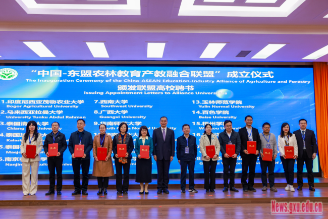 Vào ngày 20 tháng 12, lễ thành lập "Liên minh hội nhập giáo dục-công nghiệp giáo dục nông lâm nghiệp Trung Quốc-ASEAN" và Hội thảo phát triển hội nhập giáo dục- công nghiệp nông lâm nghiệp Trung Quốc-ASEAN lần thứ nhất đã được tổ chức tại trường của chúng tôi. Phó Bí thư Đảng ủy, Hiệu trưởng Đại học Quảng Tây Hàn Lâm Hải đã tham dự cuộc họp và có bài phát biểu.phó bí thư tổ Đảng, phó giám đốc Sở Giáo dục Khu tự trị dân tộc Choang Quảng Tây Diêm Bính Thìn, kỹ sư nông nghệ Sở Nông nghiệp và Nông thôn Khu tự trị dân tộc Choang Quảng Tây Tả Minh, vàtuần thị viên cấp II của Cục Lâm nghiệp Khu tự trị dân tộc Choang Quảng Tây Tưởng Quế Hùng đã tham dự cuộc họp và lần lượt có bài phát biểu. Tiêu Kiến Trang, phó hiệu trưởng Đại học Quảng Tây đã tham dự cuộc họp, Phùng Gia Huân, phó hiệu Đại học Quảng Tây chủ trì cuộc họp.