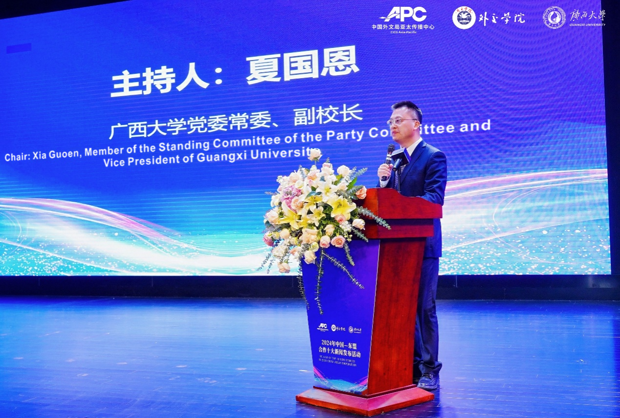 Xia Guoen menyebut bahawa 2024 merupakan Tahun Pertukaran Rakyat China-ASEAN, menandakan tahun penting bagi kedua-dua pihak untuk meningkatkan kerjasama mereka ke tahap yang baharu. China dan ASEAN telah mencapai hasil yang membuahkan hasil dalam bidang seperti daya sambungan infrastruktur, kerjasama ekonomi dan perdagangan, pertukaran budaya, inovasi teknologi, dan kerjasama pendidikan, memberikan momentum yang kuat kepada keamanan dan kemakmuran serantau. Di Universiti Guangxi, semua tetamu berkumpul untuk menyaksikan acara pelancaran "Sepuluh Berita Teratas mengenai Kerjasama China-ASEAN 2024" dan untuk membayangkan masa depan yang cerah untuk kerjasama China-ASEAN pada tahun 2025.