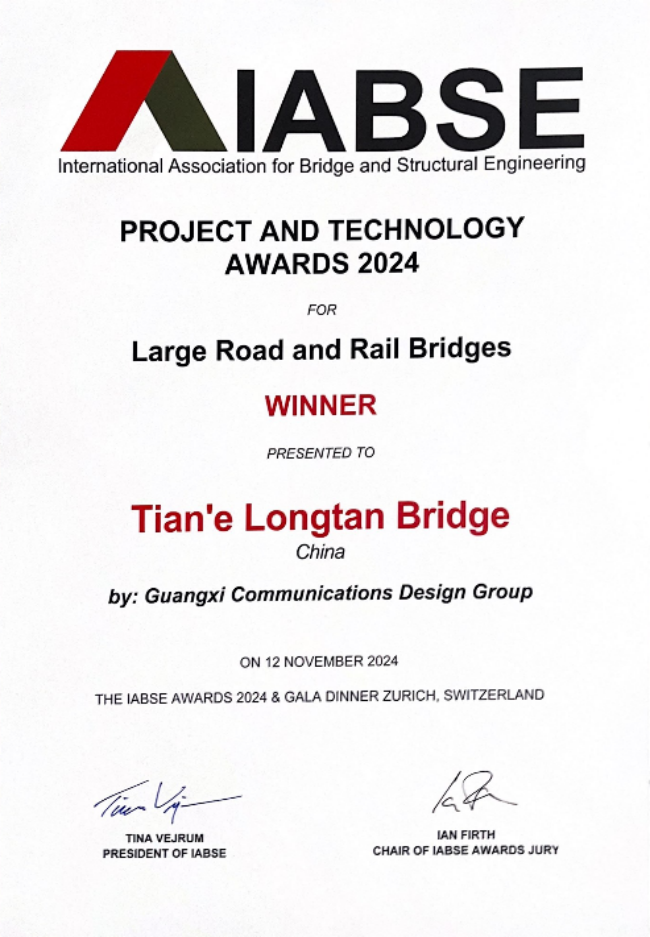 နိုဝင်ဘာလ ၁၂ ရက်နေ့တွင် ဆွစ်ဇာလန်နိုင်ငံ ဇူးရစ်မြို့၌ ကျင်းပသော အပြည်ပြည်ဆိုင်ရာ တံတားနှင့် ဖွဲ့စည်းမှု အင်ဂျင်နီယာ အဖွဲ့ချုပ် (IABSE) ၏ ဆုပေးပွဲတွင် တီယန်အယ် လုံတန် မဟာတံတား(Tian'e Longtan Grand Bridge)သည် လမ်းနှင့် မီးရထားတံတားကြီးများအတွက် IABSE ၏ အမြင့်ဆုံးဂုဏ်ထူးဆောင်ဆုကို ရရှိခဲ့သည်။ ဤစီမံကိန်းသည် ၄၃ လကြာ ပူးပေါင်းဆောင်ရွက်မှု၏ ရလဒ်ဖြစ်ပြီး၊ တရုတ် အင်ဂျင်နီယာ အကယ်ဒမီ၏ အဖွဲ့ဝင်နှင့် ကွမ်ရှီးတက္ကသိုလ်၏ အင်ဂျင်နီယာနှင့် ဆောက်လုပ်ရေးကျောင်း၏ ပါမောက္ခ ဇင့်ဂျီလီယန် (Zheng Jielian)၏ ဦးဆောင်မှုအောက်တွင် ဒီဇိုင်းရေးဆွဲခဲ့သည်။ တံတားကို ကွမ်ရှီးသယ်ယူပို့ဆောင်ရေး ရင်းနှီးမြှုပ်နှံမှု အုပ်စုမှ ငွေကြေးထောက်ပံ့ခဲ့ပြီး၊ ကွမ်ရှီ လမ်းနှင့် တံတား အင်ဂျင်နီယာ အုပ်စုမှ ဆောက်လုပ်ခဲ့သည်။ ဒီဇိုင်းအသေးစိတ်များကို ကွမ်ရှီသယ်ယူပို့ဆောင်ရေး ဒီဇိုင်း အုပ်စုမှ ပံ့ပိုးပေးခဲ့သည်။