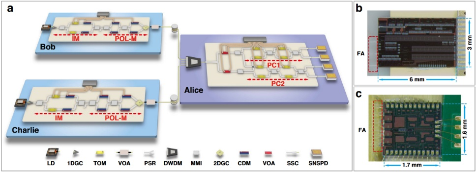 Figure 3. Experimental configuration. (a) Three-node quantum network built on integrated chips. (b) Microscopic view of the silicon-based encoder chip. (c) Microscopic view of the silicon-based decoder chip.