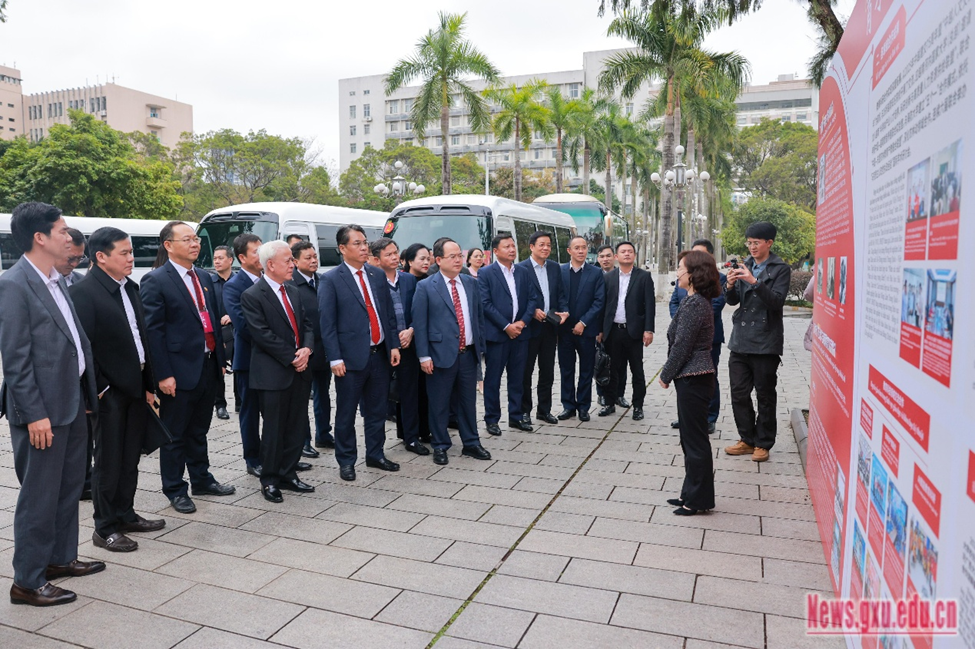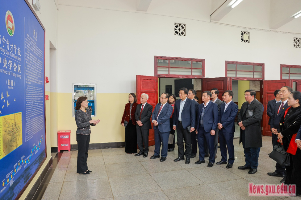 នៅសាលប្រជុំ Grand Auditorium នៃសាកលវិទ្យាល័យ Guangxi (អតីតជាអគារថ្នាក់រៀនរបស់សាលា Nanning Yucai) គណៈប្រតិភូបានស្តាប់ការណែនាំអំពីប្រវត្តិរបស់ស្ថាប័ន និងបានទស្សនាការតាំងពិព័រណ៍រូបថតក្រោមប្រធានបទ "ចំណងនៃ Yucai ចំណងមិត្តភាពចិន-វៀតណាម"។ ពួកគេទទួលបានការយល់ដឹងស៊ីជម្រៅអំពីការផ្លាស់ប្តូរការអប់រំរបស់សាកលវិទ្យាល័យក្វាងស៊ីជាមួយវៀតណាមក្នុងយុគសម័យថ្មី និងសមិទ្ធិផលសហប្រតិបត្តិការដែលសម្រេចបាន។ គណៈប្រតិភូបានវាយតម្លៃខ្ពស់ចំពោះការរួមចំណែកជាប្រវត្តិសាស្ត្ររបស់សាលា Nanning Yucai ក្នុងការបណ្តុះបណ្តាលបុគ្គលិកបដិវត្តន៍ និងកសាងប្រទេសជាតិមួយចំនួនធំសម្រាប់វៀតណាម។ ពួកគេបានទទួលស្គាល់យ៉ាងពេញទំហឹងនូវការខិតខំប្រឹងប្រែងរបស់សាកលវិទ្យាល័យក្វាងស៊ី ក្នុងការឆ្ពោះទៅមុខនូវមរតកប្រវត្តិសាស្ត្រដ៏ជ្រាលជ្រៅនៃ "ចំណងនៃយូកៃ ចំណងមិត្តភាពចិន-វៀតណាម" និងលទ្ធផលជាផ្លែផ្កាដែលសម្រេចបានក្នុងការផ្លាស់ប្តូរអប់រំ និងកិច្ចសហប្រតិបត្តិការជាមួយវៀតណាម។ គណៈប្រតិភូបានសម្តែងក្តីសង្ឃឹមសម្រាប់ការបន្តកិច្ចសហប្រតិបត្តិការកាន់តែស៊ីជម្រៅជាមួយសាកលវិទ្យាល័យ Guangxi លើវិស័យដូចជាការបណ្តុះទេពកោសល្យ និងការផ្លាស់ប្តូរយុវជន ព្រមទាំងបានបន្តការអញ្ជើញដោយស្មោះស្ម័គ្រចំពោះថ្នាក់ដឹកនាំសាកលវិទ្យាល័យដើម្បីដឹកនាំគណៈប្រតិភូមកបំពេញទស្សនកិច្ចនៅវៀតណាម។