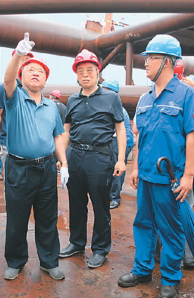 郑皆连(左一)在平南三桥加工制造现场。