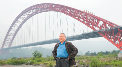 郑皆连主持建造的四川泸州合江长江一桥(二〇一三年建成)是国家高速公路网成渝地区环线的控制性工程,跨径五百三十米,是当时最大跨径的钢管混凝土拱桥。图为郑皆连在桥前留影。