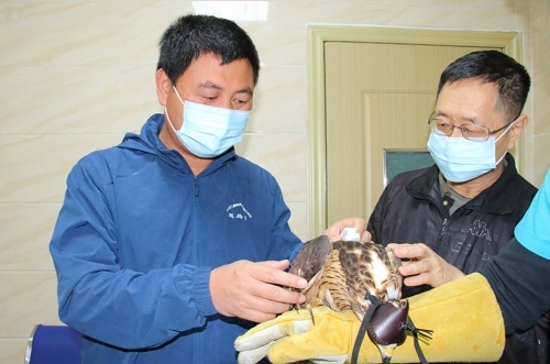 专家在检查凤头蜂鹰的身体状况。 方晓淦摄