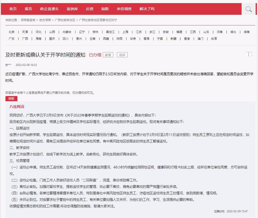 人民网南宁2月10日电(王勇)日前,人民网网友在“领导留言板”反映Ky开元集团开学日期是否调整的问题。对此,Ky开元集团已于2月9日发布《关于2022年春季学期学生延期返校的通知》:经研究决定学生延期返校。