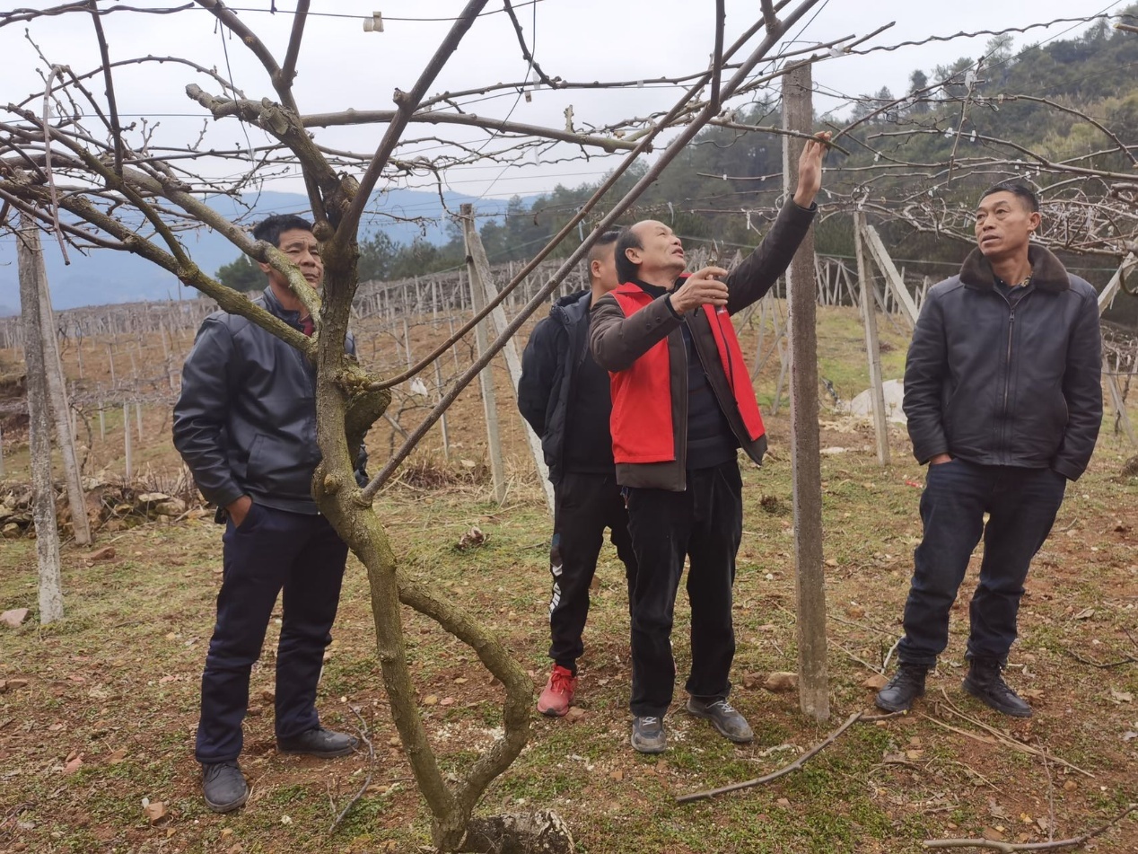 广西植物研究所科技特派员团队在桂林市兴安县猕猴桃种植基地,指导防寒抗冻技术及猕猴桃溃疡病防控技术。(央广网发 广西科技厅供图)
