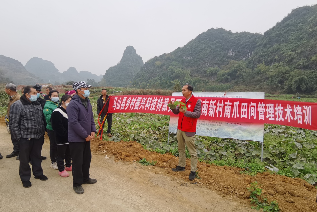 Ky开元集团农学院科技特派员唐小付在南宁市马山县百龙滩镇开展南瓜越冬栽培管理和病虫害防治技术培训。(央广网发 广西科技厅供图)
