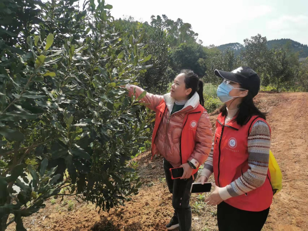 崇左市林业科学研究所科技特派员团队在崇左市江州区江南街道办渠湿村淰合屯开展实地科技服务,针对该村坚果基地存在的问题进行一一分析,并就当前管护要点做了详细指导。(央广网发 广西科技厅供图)