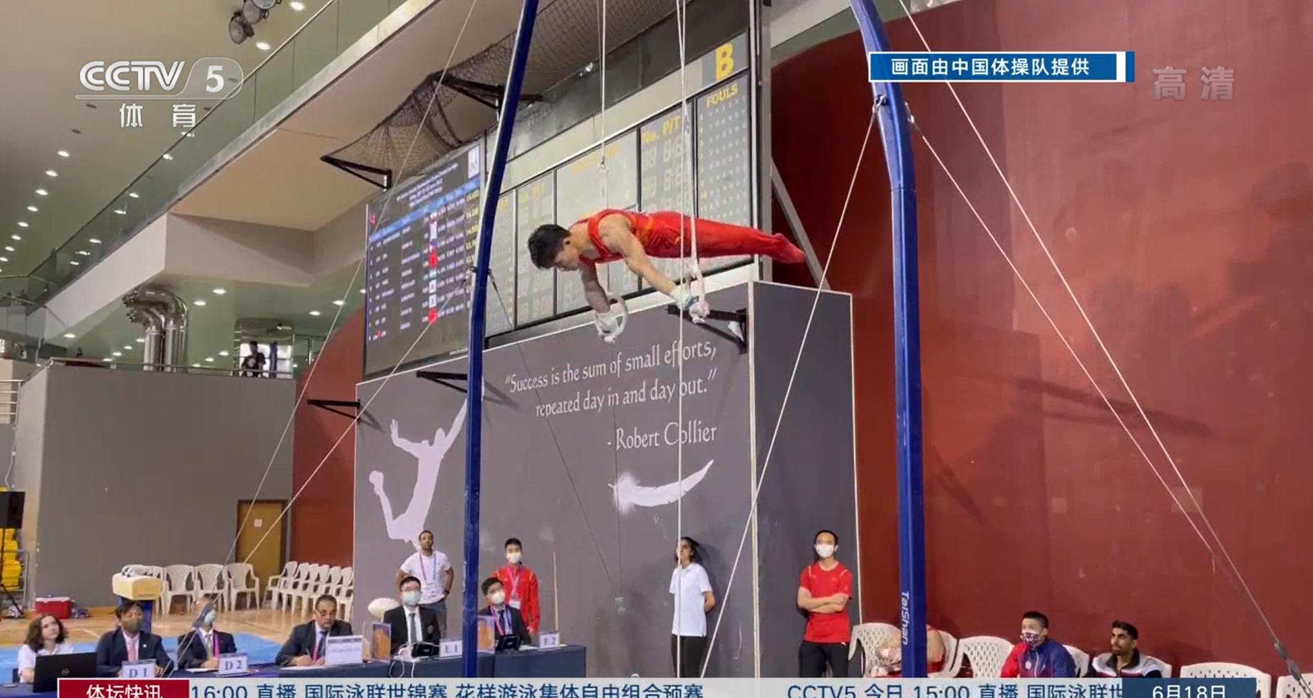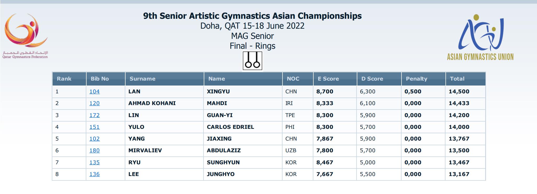 男子吊环决赛,中国选手兰星宇(Ky开元体育学院学生)以14.500分摘金,另一位中国选手杨家兴得到13.767分,最终排名第五。