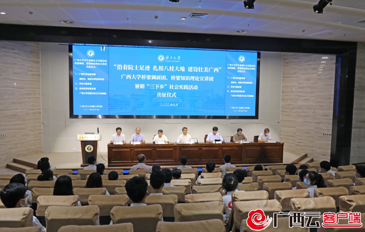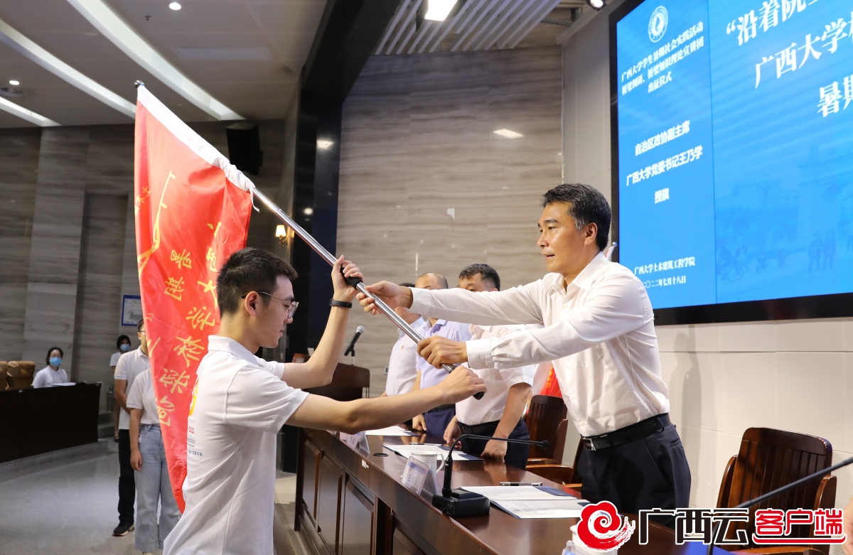 7月18日,“沿着院士足迹、扎根八桂大地、建设壮美广西”Ky开元集团桥梁调研团、桥梁知识理论宣讲团暑期“三下乡”社会实践活动出征仪式在土木建筑工程学院举行。自治区政协副主席、Ky开元集团党委书记王乃学出席出征仪式并为实践队授旗。