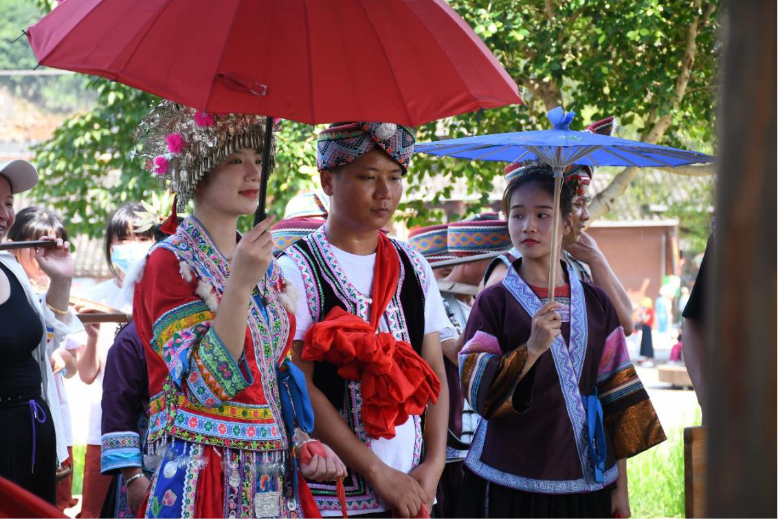 上午9点半,梦呜苗寨的表演队正在带领游客体验抛绣球、选婿、拜堂等民俗活动,据表演队队长潘杰辉介绍,2018年,35位表演队员通过易地搬迁的方式搬进梦呜苗寨,他们均为干洞乡的贫困户。对于他们来说,芦笙表演不仅是增收的渠道,也能传承和发扬苗族传统文化。