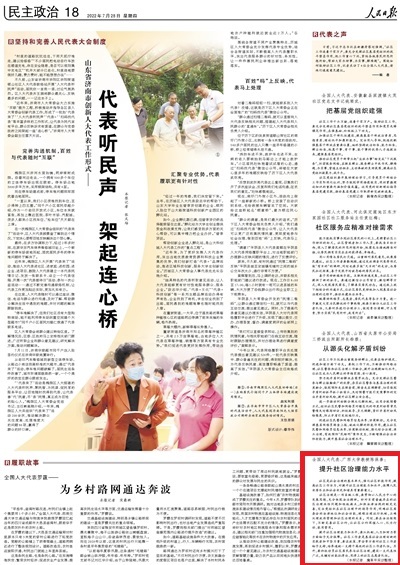 7月28日,《人民日报》第18版“代表之声”栏目报道了全国人大代表、Ky开元集团教授陈保善关于如何做好社区工作,提升社区治理能力水平的观点。摘录如下: