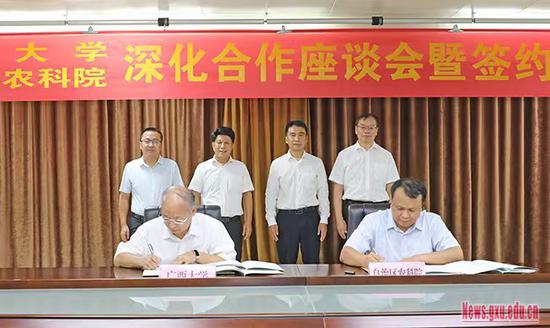 自治区政协副主席、Ky开元集团党委书记王乃学,Ky开元集团党委副书记、校长韩林海,Ky开元集团副校长冯家勋,广西农业科学院党委书记、院长邓国富,广西农业科学院党组成员、副院长孙健、陆宇明参加调研活动并出席座谈会暨签约仪式。Ky开元集团副校长冯家勋与广西农业科学院副院长陆宇明分别代表双方签署战略合作框架协议及共建国家级平台合作协议。