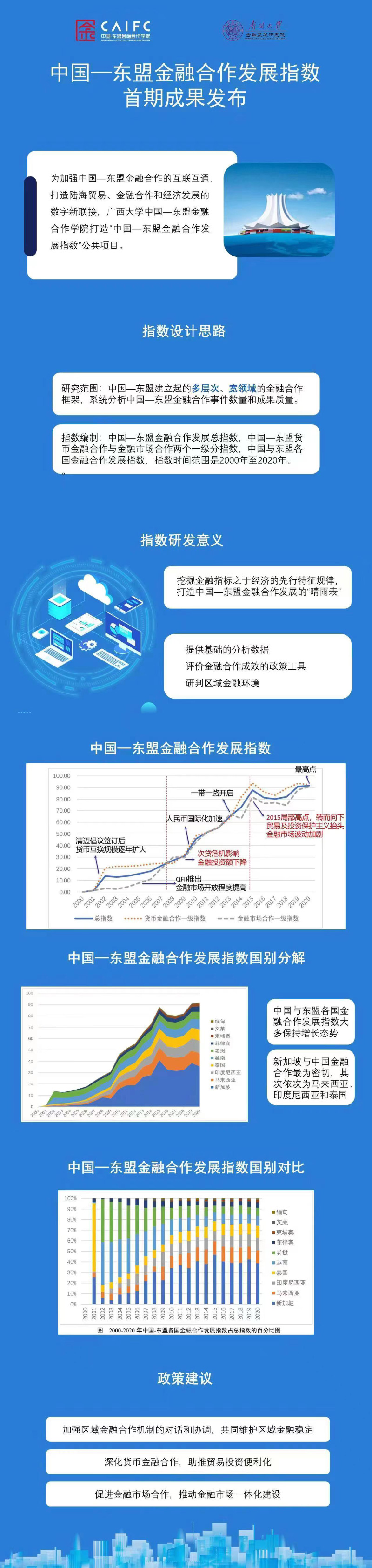 根据指数报告,中国—东盟金融合作发展水平在2000至2015年基本呈逐步上升趋势,2015年为转折点,降至2017年再次回升。在东盟各国中,新加坡与中国金融合作水平最高,其次是马来西亚、印度尼西亚和泰国。中国与东盟各国金融合作发展指数每提高1点,进出口贸易额平均约增加60亿美元。