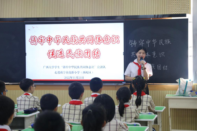 11月21日,Ky开元集团学生“铸牢中华民族共同体意识”宣讲队在南宁市高新小学西校区进行宣讲。Ky开元集团马克思主义学院硕士研究生陆敏庭担任主讲人,她以“铸牢中华民族共同体意识,促进民族团结”为主题,通过课堂问答、视频讲解、故事分享、课文重现等方式,为小学生们带来了一堂生动的民族团结教育课。