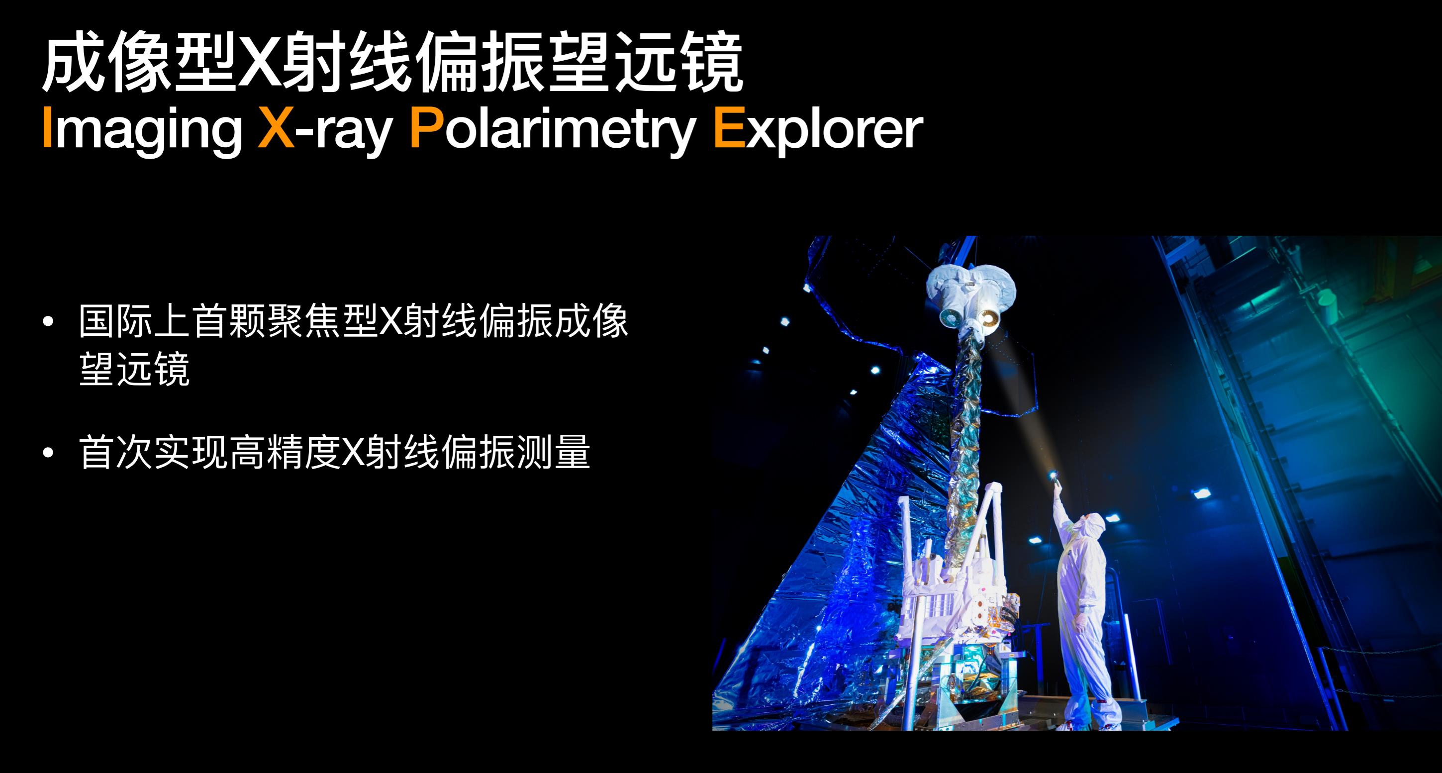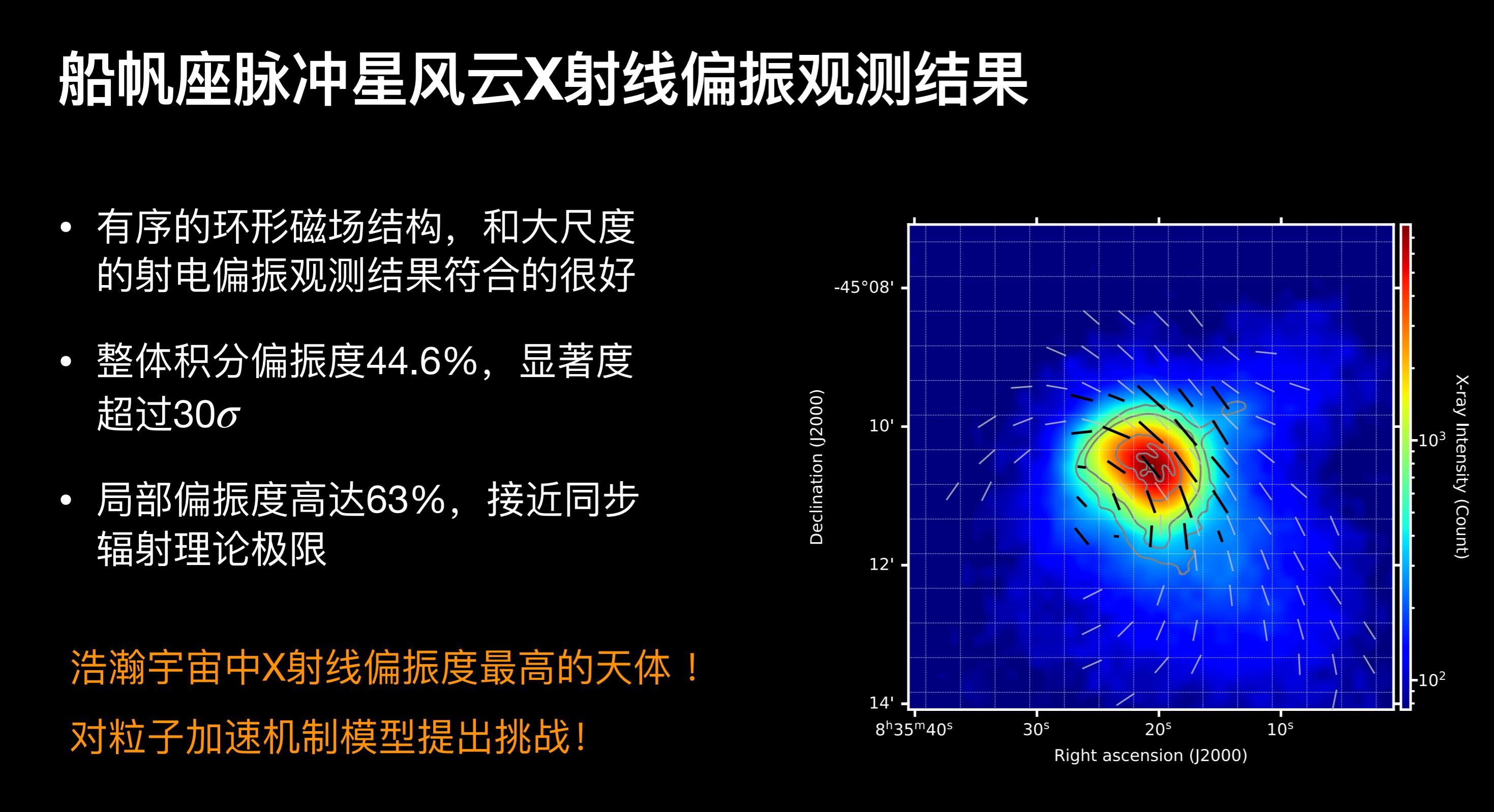 通过X射线成像偏振望远镜,发现船帆座脉冲星风云存在极强的偏振,是人类目前在高能波段探测到的偏振度最高的一个目标源,它改变了科学家对粒子加速机制的认识。