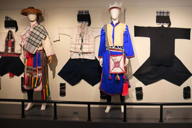 展厅中陈列着许多精美的彝族服饰。据张正淳介绍,纯手工制作彝族服饰一般需要半年时间,要经历种植和收取棉花、纺成线、织布、浸染、缝制、刺绣等程序,才得以制作完成一件精美的彝族服饰。