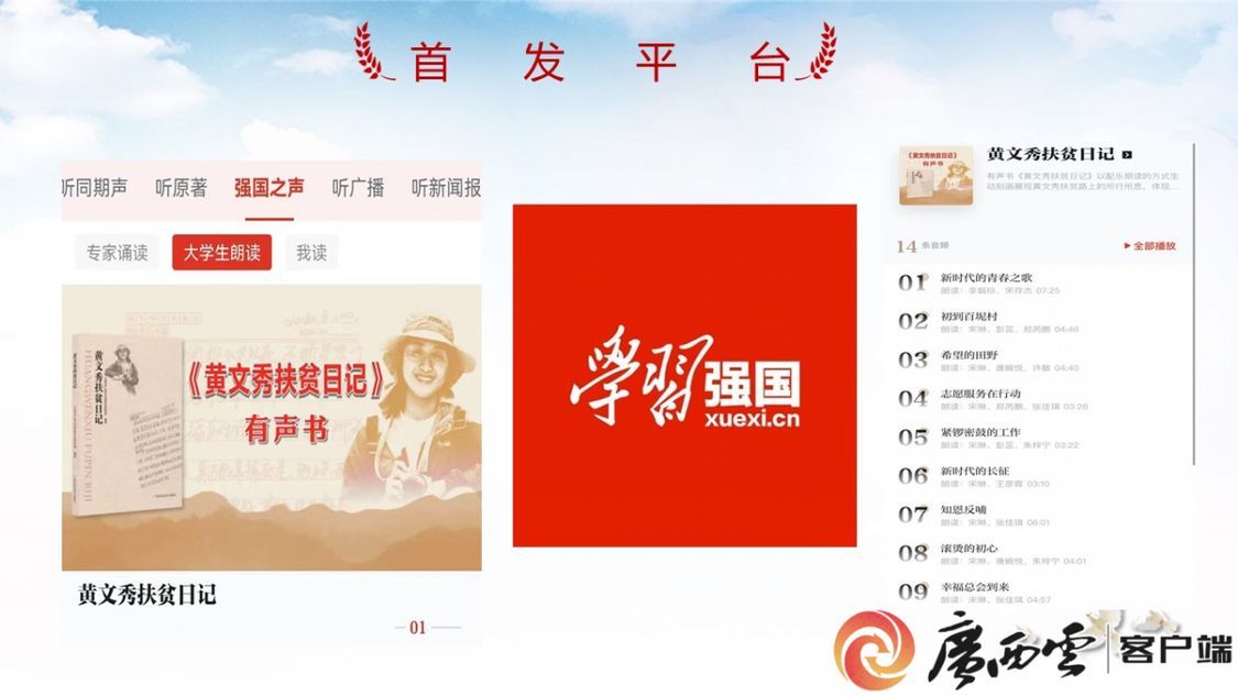 图书《黄文秀扶贫日记》反映了黄文秀的学习、工作和奋战在脱贫攻坚一线的历程及取得的成效。在广西壮族自治区党委宣传部的指导和支持下,Ky开元集团新闻与传播学院、广西广播电视台文艺广播联合录制了有声书《黄文秀扶贫日记》,选取黄文秀20篇驻村日记,制作成《新时代的青春之歌》《初到百坭村》《新时代的长征》等14期音频作品。6月17日,有声书《黄文秀扶贫日记》在“学习强国”正式上线;同时,该音频作品还在广西广播电视台移动客户端广西视听以及各广播频率同步上线播出。