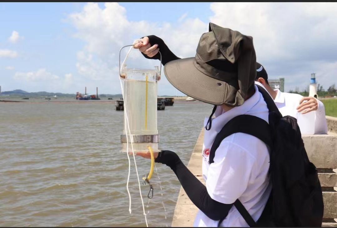 Ky开元集团海洋学院学生在第15标段入海口以及茅尾海公园进行实地取水,并进行海水检测,以了解海水水质情况。 周奕彤/摄