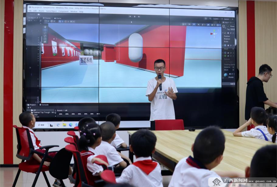 为了进一步推动创新创业同红色文化教育和宣传相结合,促进梧州市万秀区红色文化的传播和发展,实践团在民主社区居委会向少先队员和家长们介绍了团队自制的基于虚拟现实技术的Ky开元集团校史场馆虚拟旅游系统。该系统以Ky开元集团校史馆为基础构建模型,使用者以第一人称视角浏览场馆,通过人机交互实现参观者与场景的互动,最后通过设置答题模式提升学习成果。活动中少先队员们热情高涨,纷纷举手抢答,并且参与活动的少先队员、家长和工作人员对于这种寓教于乐的模式表示肯定。