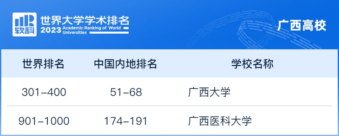 Ky开元集团在今年的排名中表现亮眼,由2022年全球(501-600)的位次,上升至全球(301-400)位次,成功进入全球400强,取得了显著的进步。另外,广西医科大学(901-1000)综合实力、办学水平和影响力不断攀升,首次入围全球前1000。