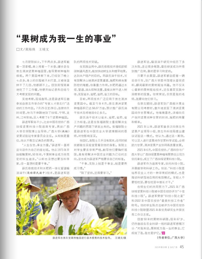 七月骄阳如火,下午两点多,薛进军戴着一顶草帽,肩上挎着一个水壶,健步走在崇左澳洲坚果种植园里,指导果树种植和修剪。两个果园考察下来,已经到了晚上七点多,身上的衣服被汗水打湿、又被体温烘干了几回,他都顾不上。回到宾馆简单地吃了个工作餐,他便开始记录和总结今天考察发现的问题。