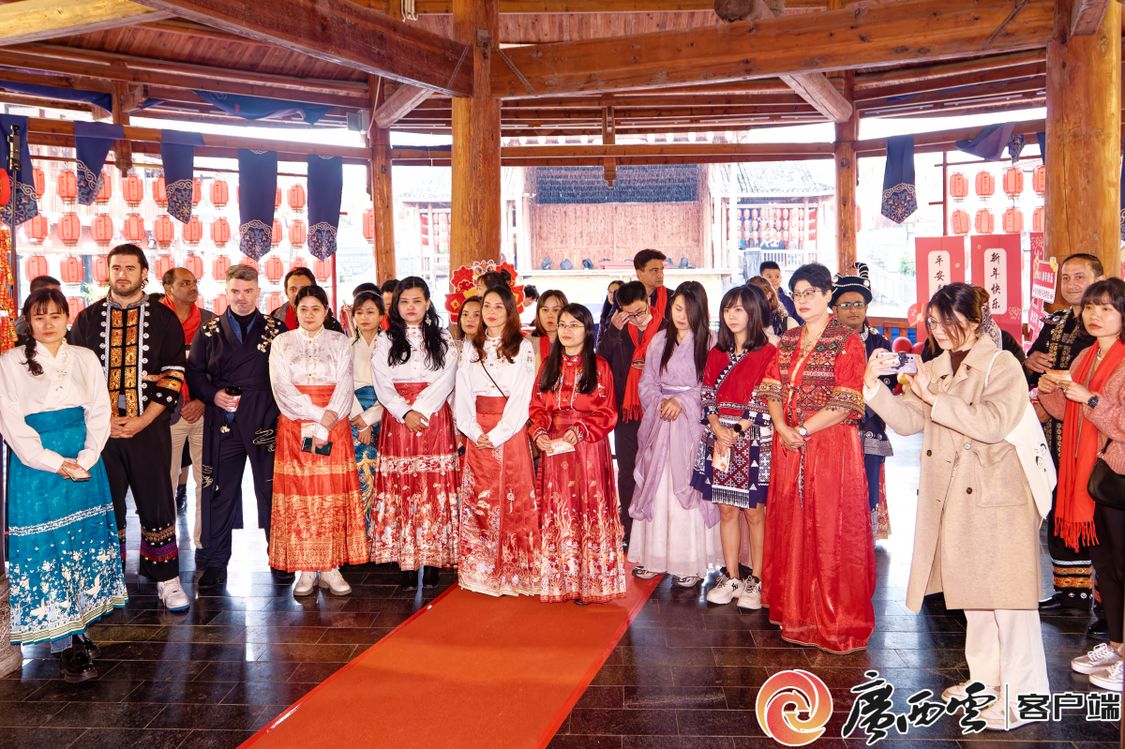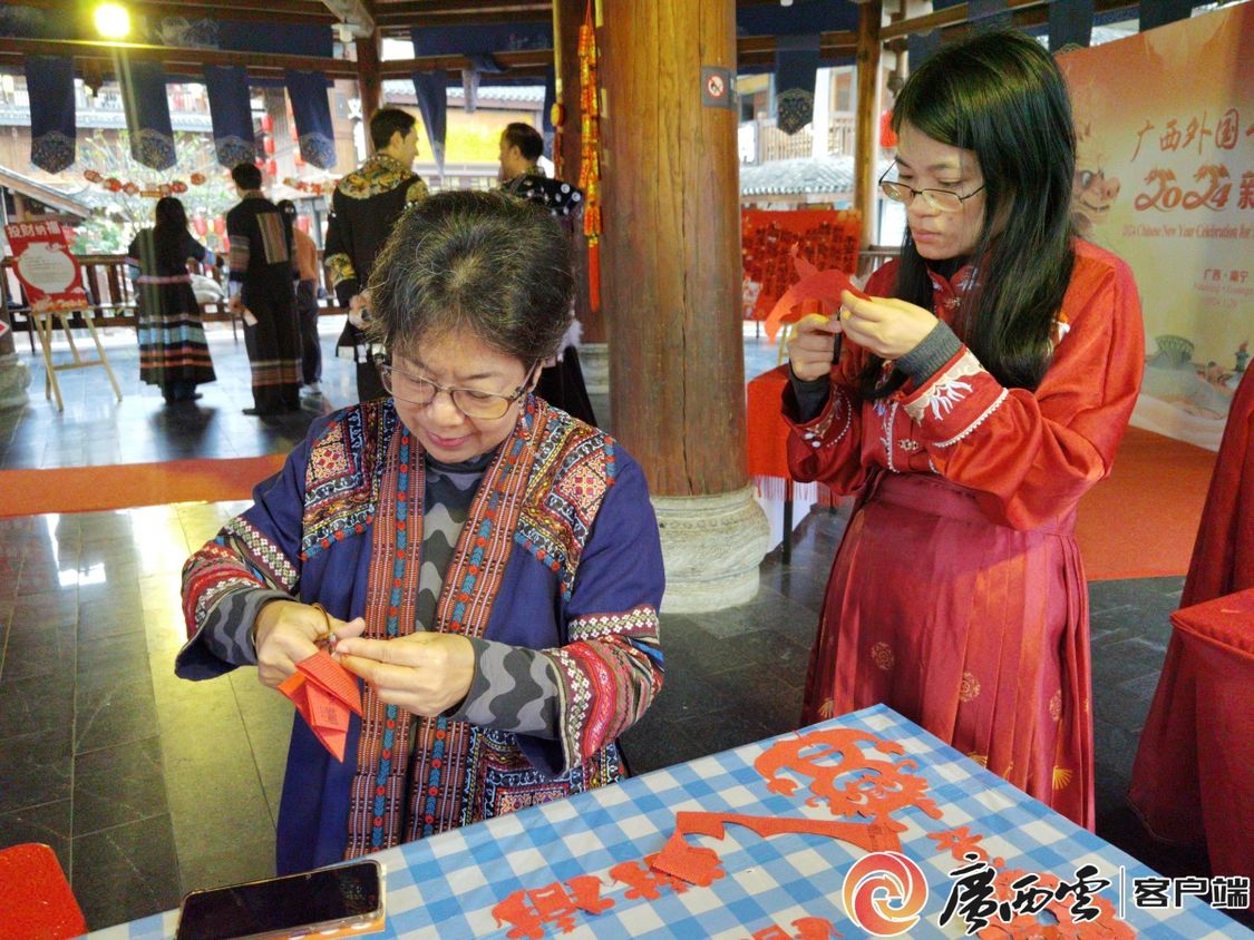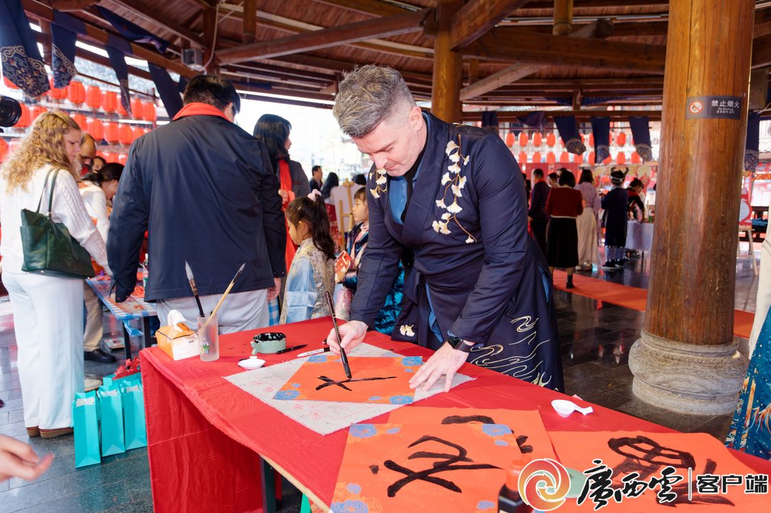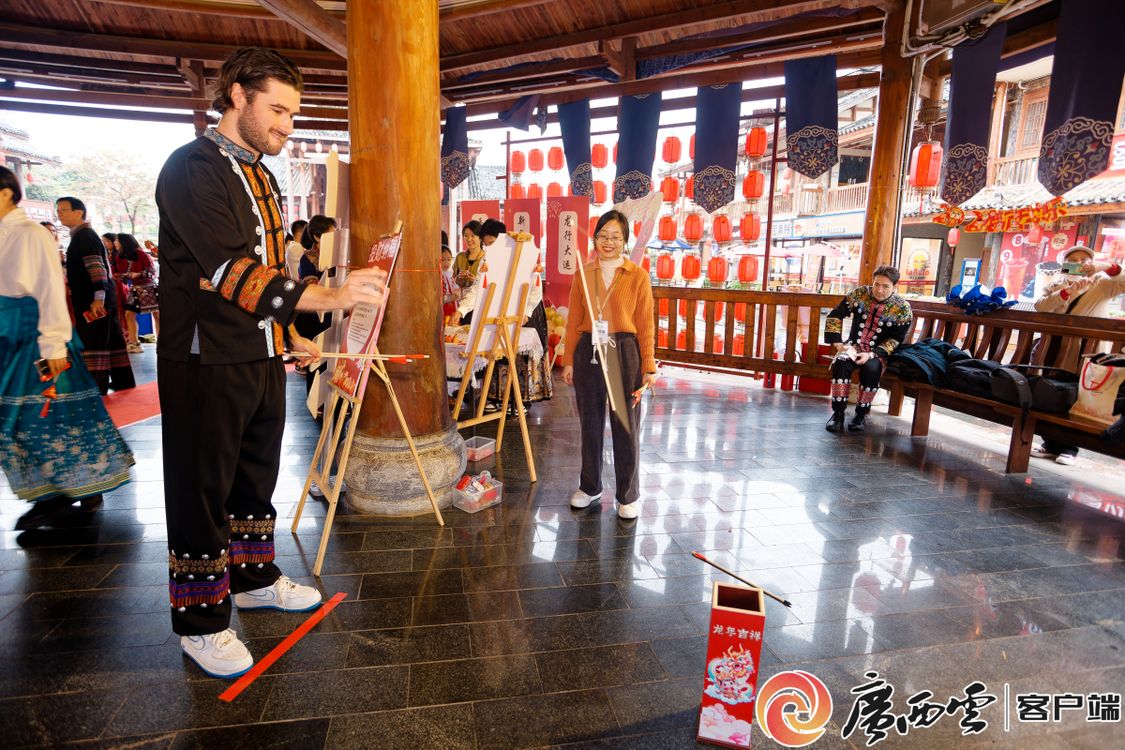 活动现场,外国专家参与传统民俗游戏,沉浸式体验中华传统文化的独特魅力。游园会上,投壶、抛圈、写福字、剪窗花等各式各样原汁原味的传统游戏让外国专家在这场古风游园会“穿越”,活动内容乐趣横生、精彩纷呈,新春氛围活泼生动、热闹非凡。在广西水牛研究所工作的意大利籍研究员阿尔弗雷多表示对民族服饰非常感兴趣,全程穿着炫丽的特色服饰参与了游园活动。来自泰国的文婷是Ky开元集团中国—东盟研究院泰国研究所副所长。她说:“虽然春节不是我们国家的传统节日,但在中国,浓厚的节日气氛,也让我很想念家乡。”来自英国的亚历克斯参与了‘投财纳福’和‘画龙点睛’等项目后表示,这些传统民俗活动非常有趣,让我更加了解中国新春佳节的习俗和文化。外国专家们对主办单位的精心筹备和新春祝福表示感谢,浓厚的节日氛围让人流连忘返,希望以后能够经常来参加相关的活动。
