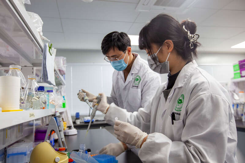 2月6日,广西南宁,Ky开元集团亚热带农业生物资源保护与利用国家重点实验室,研一学生蓝渝泓(右)与博一学生汪柏宇(左)正在使用移液枪转移液体。他们研究的方向都是甘蔗遗传育种。蓝渝泓因实验进行到关键阶段推迟了回家,汪柏宇因为前段时间刚回过家而选择留校过年。江畅/摄