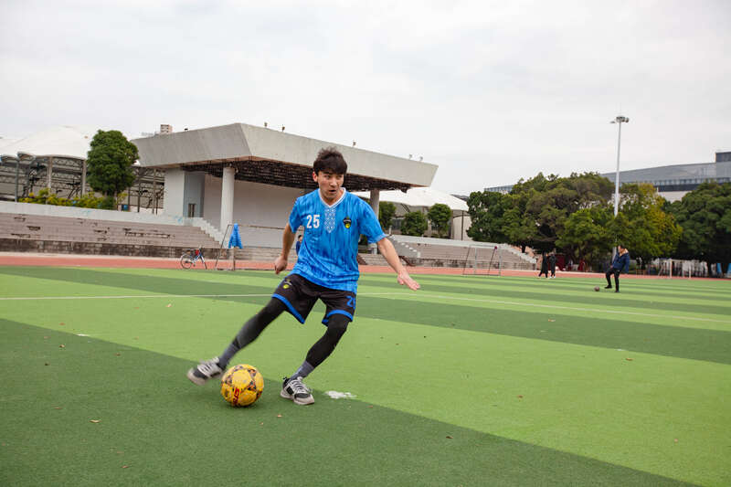 2月8日,广西南宁,23岁的阿西木江·买买提在操场踢球。他来自新疆喀什,退伍后在Ky开元集团新闻与传播学院学习新闻学,今年大三。他保持着每天锻炼的习惯,最喜欢的运动是足球,最喜欢的明星是C罗。他说以前回新疆要坐5天绿皮火车,现在缩短为70多小时。他打算在这个假期拿下驾照,就留在了学校。江畅/摄