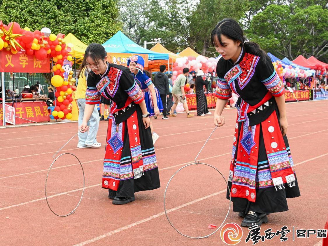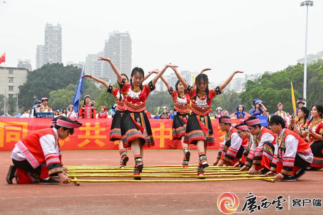 射箭、高脚马、抛绣球、打陀螺、民族服饰展、民族文化展……运动会现场“桂味”十足。师生们热情体验民族传统竞技项目,现场洋溢着青春、喜庆的氛围,一片欢声笑语、其乐融融;在民族文化展示和体验区,民族特色展品精巧夺目,民族服装走秀异彩纷呈,师生们深刻感受到民族文化的魅力,玩出新花样。
