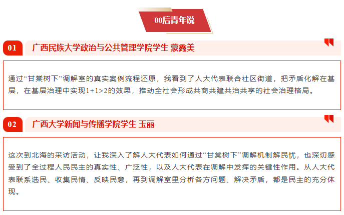 “我们更多是起了桥梁作用,加强群众和政府部门双方沟通,通过听取意见、走访调查、多方协调、整合力量,推动问题得到有效解决。”多次参与纠纷调解的北海市、海城区两级人大代表肖柏丰如是说。