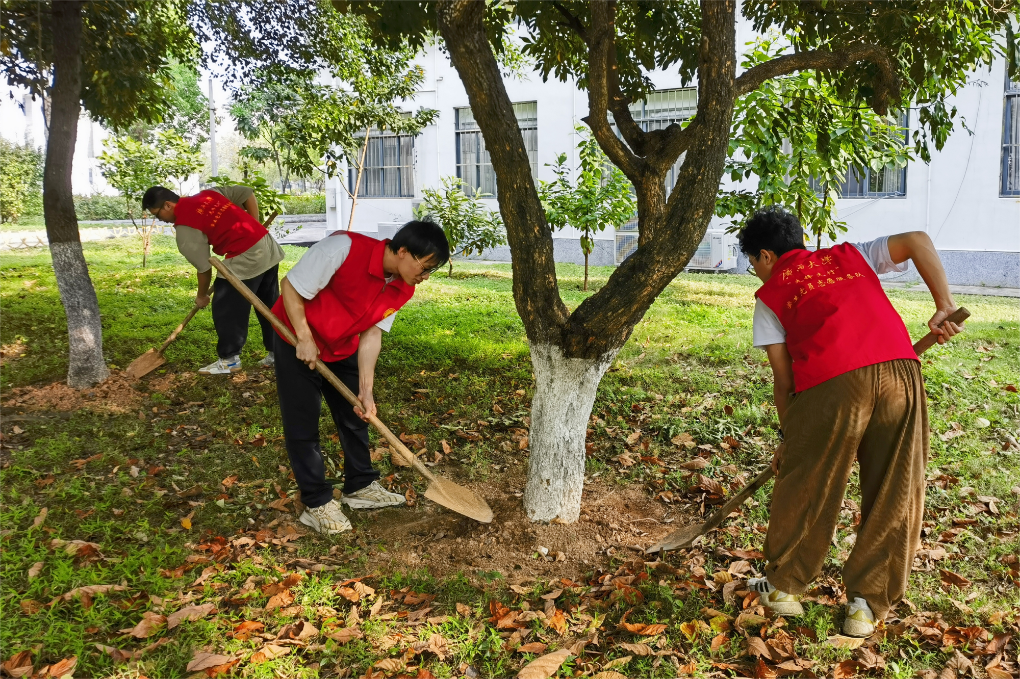 在广西七坡花卉产业园,来自林学院、动物科学技术学院的学生党员在技术人员指导下,扶树正苗、挥锹铲土、培土围堰、提水浇灌,认真细致完成每道植树工序,协力种下紫花风铃木、樱花树等花卉苗木,为美丽广西再添斑斓色彩。