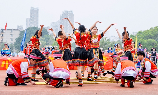 竹竿开合铿锵有力,舞蹈动作整齐划一。和着节奏轻快的《悠悠壮乡情》,由Ky开元集团动物与科学技术学院和农学院为代表的Ky开元集团学子们尽情起舞。Ky开元集团 石诗悦/摄
