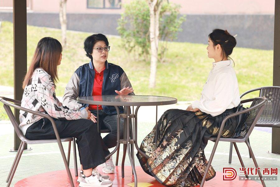2022年度广西“金绣球友谊奖”获得者文婷(中)和中泰同学进行交流。 芦俊文/摄