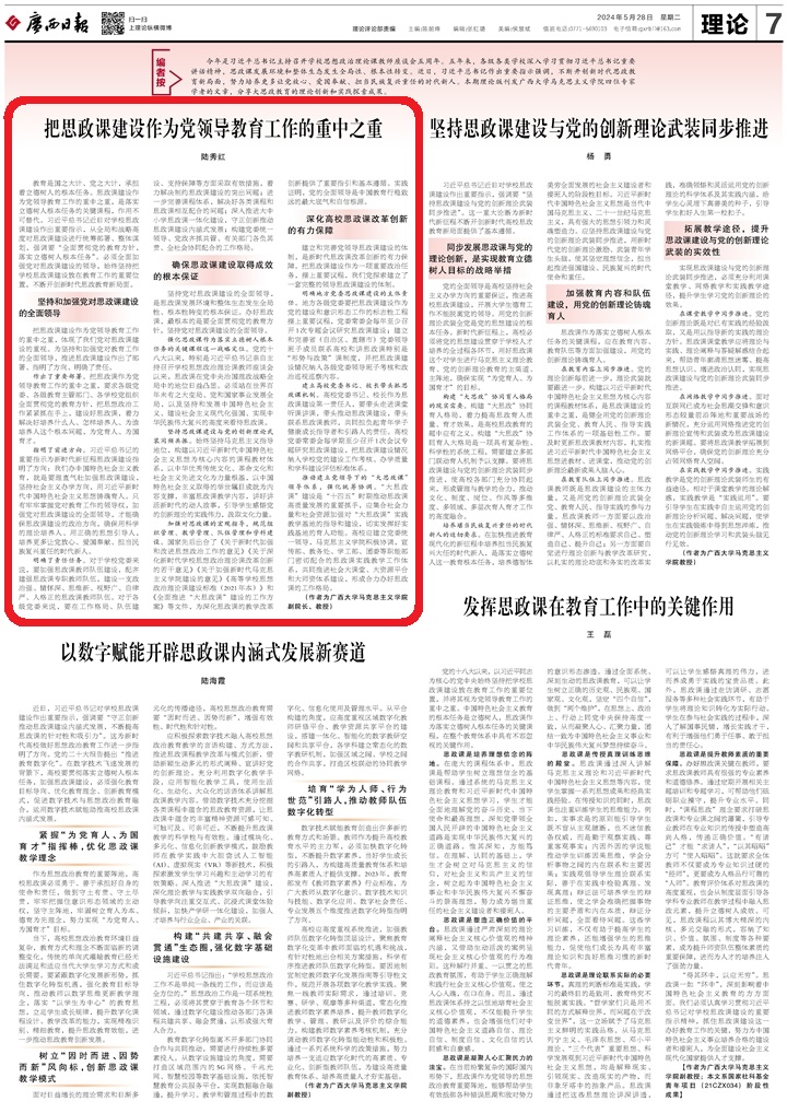 今年是习近平总书记主持召开学校思想政治理论课教师座谈会五周年。五年来,各级各类学校深入学习贯彻习近平总书记重要讲话精神,思政课发展环境和整体生态发生全局性、根本性转变。近日,习近平总书记作出重要指示强调,不断开创新时代思政教育新局面,努力培养更多让党放心、爱国奉献、担当民族复兴重任的时代新人。本期理论版刊发Ky开元集团马克思主义学院四位专家学者的文章,分享大思政教育的理论创新和实践探索成果。
