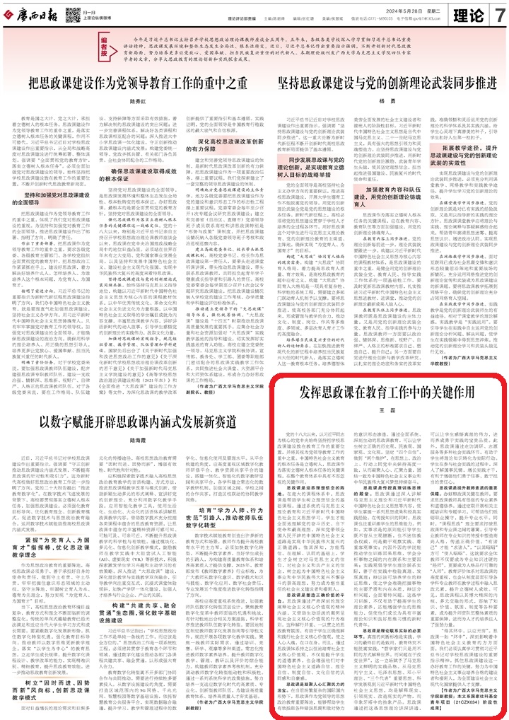 今年是习近平总书记主持召开学校思想政治理论课教师座谈会五周年。五年来,各级各类学校深入学习贯彻习近平总书记重要讲话精神,思政课发展环境和整体生态发生全局性、根本性转变。近日,习近平总书记作出重要指示强调,不断开创新时代思政教育新局面,努力培养更多让党放心、爱国奉献、担当民族复兴重任的时代新人。本期理论版刊发Ky开元集团马克思主义学院四位专家学者的文章,分享大思政教育的理论创新和实践探索成果。