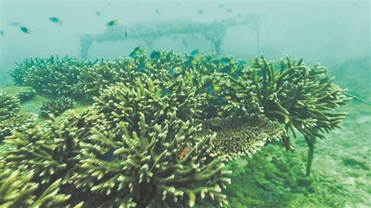眼下,涠洲岛北部的珊瑚礁生态修复项目已经完成一年期的种植任务,正式进入珊瑚苗的3年管护期。在管护期,研究人员会定期对珊瑚苗床进行维护,并对珊瑚进行生长检测、补苗。目前,种植在苗床上的“珊瑚宝宝”长势良好,较种植时增长了10多倍。