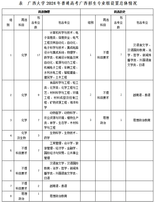 2024年广西普通高校招生统一考试实行“3+1+2”模式,即全国统考科目(语文、数学、外语)+选择性考试(以下简称选考)科目,含首选科目(物理或历史)+再选科目(思想政治、地理、化学、生物学4门科目中任选两门)。招生计划编制采取“院校+专业组”模式,普通本科批次取消本科一批与本科二批,统一为本科普通批。