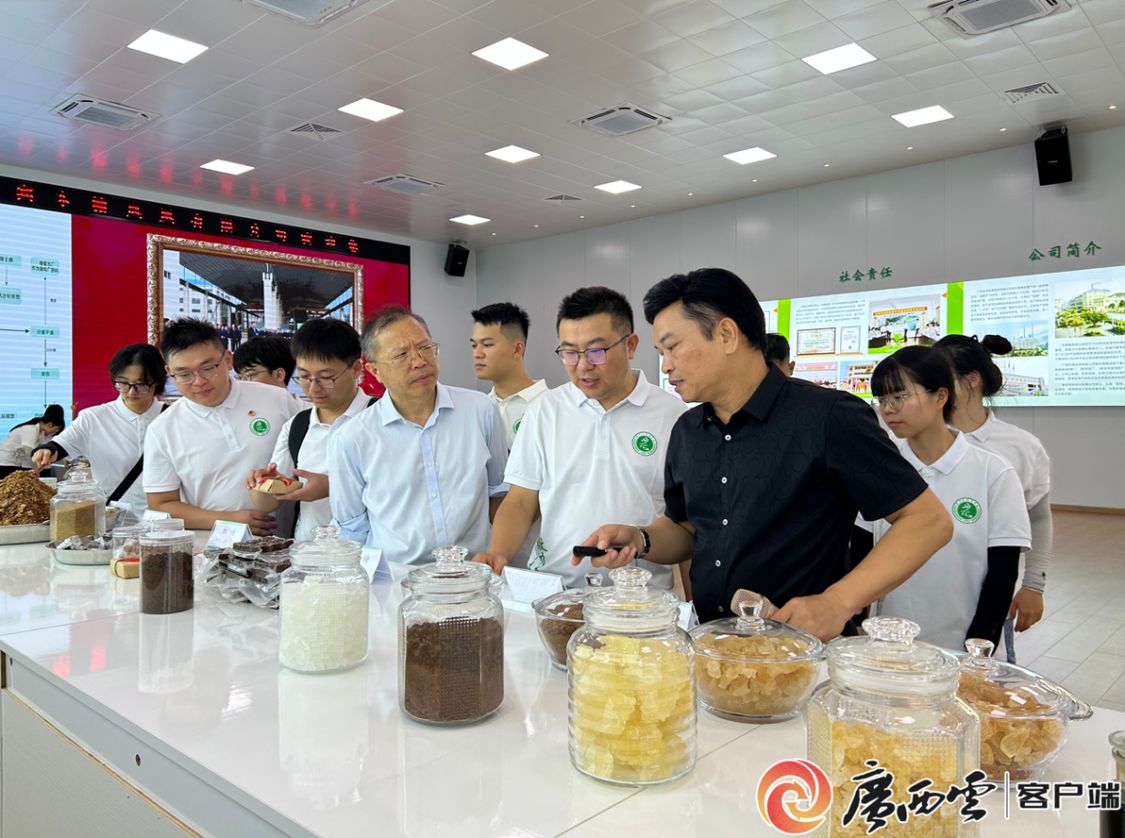 随后,实践团队来到东糖凤凰有限公司,参观甘蔗提汁车间及产品展厅,了解蔗糖全产业链发展情况,通过实地参观、面对面提问等方式,共同探索如何按照⾼端化、智能化、绿⾊化要求,加大科技创新力度,延伸产业链、提高附加值,不断提质、降本、增效,推动糖业高质量发展。