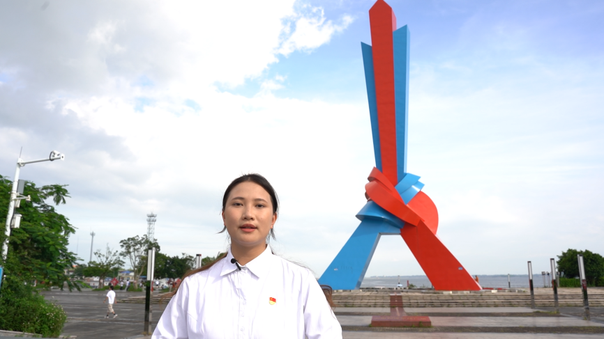 实践团成员吴艳贝同学在山海相连地标广场录制丝路精神宣讲视频(张晓荣摄)