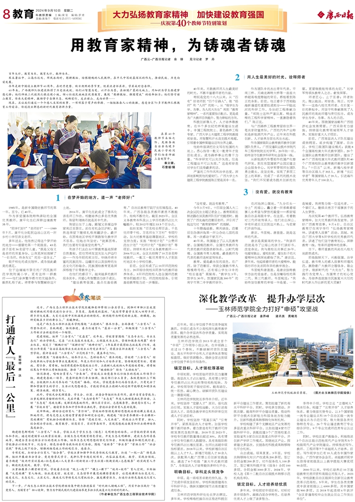40年来,广西教师队伍建设取得了历史性成就。他们以智慧为笔、以汗水为墨,在祖国广袤的大地上,用知识为学生搭建梦想之桥;他们师徒三代毅然扎根边境小城,倾心打造民族地区优质教育,展现“躬耕教坛、强国有我”的使命担当;他们坚守瑶山教育,传承大爱精神,激励学子自强不息、砥砺前行,走出瑶山、走向世界……