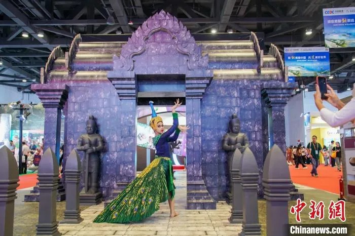 9月26日,第21届中国—东盟博览会上演员在柬埔寨暹粒省展位的“吴哥窟”起舞。陈冠言 摄
