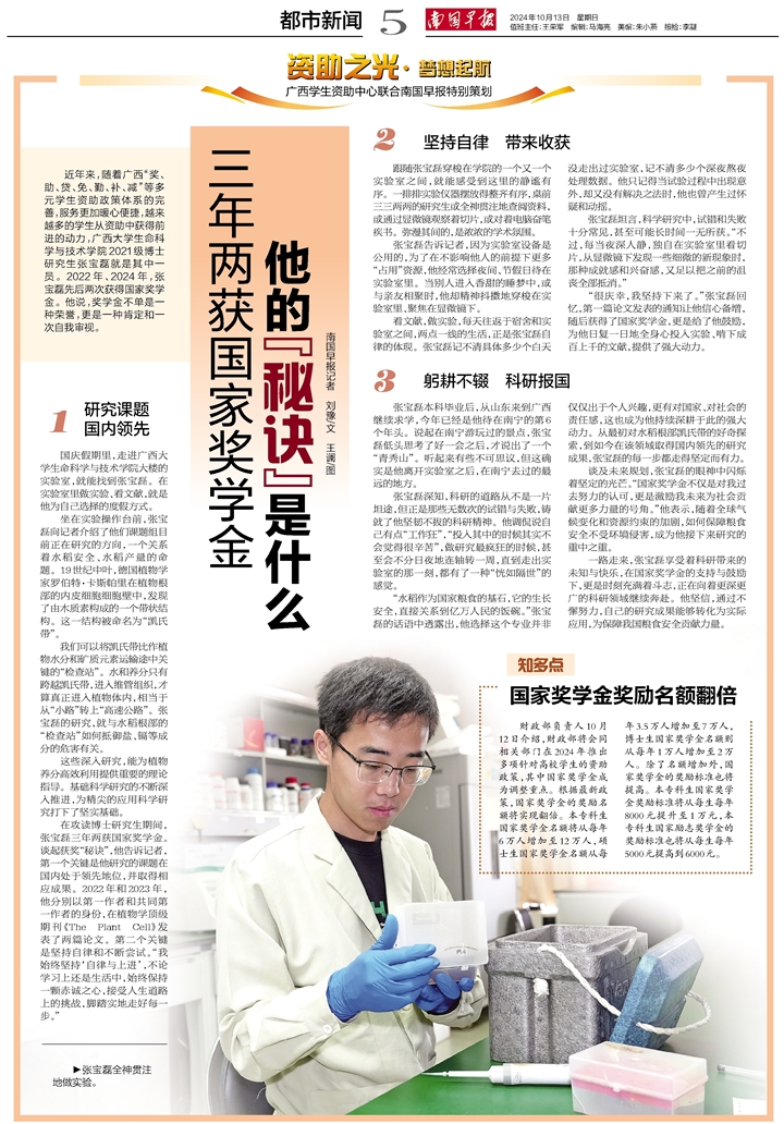 近年来,随着广西“奖、助、贷、免、勤、补、减”等多元学生资助政策体系的完善,服务更加暖心便捷,越来越多的学生从资助中获得前进的动力,Ky开元集团生命科学与技术学院2021级博士研究生张宝磊就是其中一员。2022年、2024年,张宝磊先后两次获得国家奖学金。他说,奖学金不单是一种荣誉,更是一种肯定和一次自我审视。