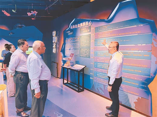 这座依托广西相关重点实验室,以南海珊瑚岛礁为特色,集教学、科研、科普功能于一体的展馆,陈列着多种多样的海洋生物标本。代表团边走边看,对珊瑚产生了浓厚兴趣,与工作人员进行亲切交流,了解海洋生态系统以及珊瑚礁的保护成果。