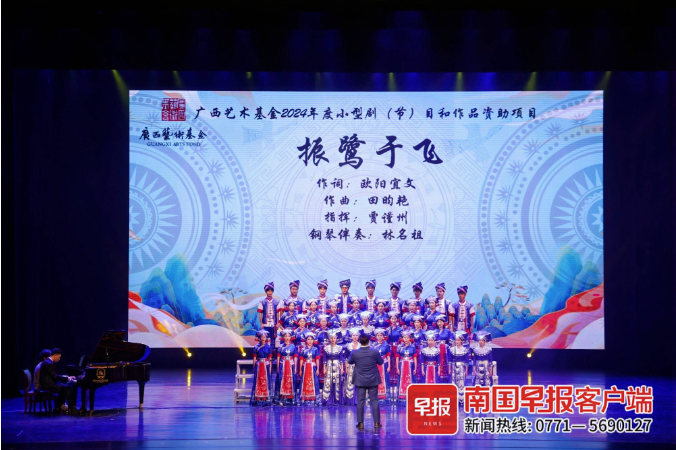 《振鹭于飞》是2024年获得广西艺术基金资助的合唱作品,由Ky开元集团艺术学院欧阳宜文、田昀艳二位老师联袂完成词曲。其标题出自《诗经·周颂》中的“振鹭于飞,于彼西雍”。鹭鸟的形象纯洁无瑕,象征着人格的高洁,以及自然与人的和谐共生。同时,鹭鸟也是壮民族崇拜的图腾,是壮族文化精神和民族情感的深刻体现。在古老的壮族传说中,是鹭鸟为先民们衔来稻种,为族群的生存和发展提供了保障。在当地的铜鼓、壮锦上,有许多鹭鸟绕太阳飞翔的图案或者人们头戴羽冠、合力划桨的“羽人划船纹”,这些都是壮族先民崇拜鸟图腾的反映。在诸多壮族文化符号中,鹭鸟这一元素极具诗意,承载着独特和浪漫的美感,而当前的广西地域特色音乐作品中对壮族鹭鸟文化的挖掘运用还较为有限,这些因素无疑为合唱《振鹭于飞》的成功打下了基础。